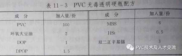 根据制品的软硬程度、透明程度、是否要求无毒、与其它助剂的协同复配选用最佳热稳定剂,才能发挥其应尽的作用。如PVC无毒透明硬瓶配方见表11-3。