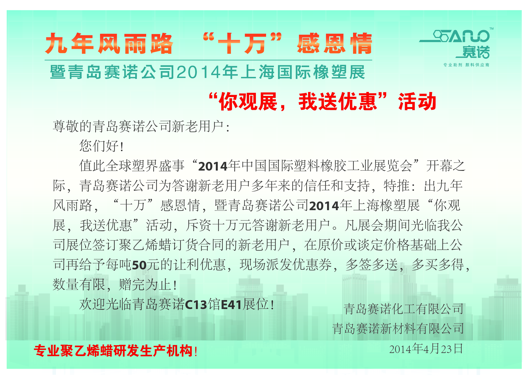 36平方米精装修大展台,以聚乙烯蜡产品、多工艺生产技术、五星级服务等为参展主题,更配合“你观展,我送优惠活动”,以一个全新的赛诺呈现给新老客户。