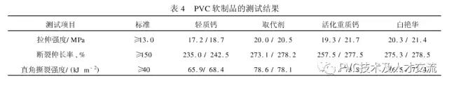 2.2 PVC软制品试验情况除了PVC硬制品外,在PVC软制品压延薄膜中进行多次小型试验,现以下面的试验为例。所用设备为捏合机(10L)及XK-160A型两辊塑炼机。配方如下:PVC100份,三盐基硫酸铅4份,硬脂酸钡2份,硬脂酸015份,增塑剂40份,轻质钙、取代剂、活化重质钙及白艳华分别为10份。所配料经捏合8min之后,置两辊机塑炼,两辊机温度为170e,塑炼15min之后取样测试,结果见表4。