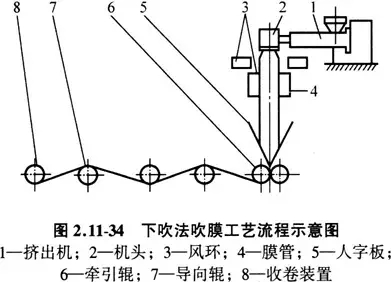 料斗上料一物料塑化挤出→吹胀牵引→风环冷却→人字夹板→牵引辊牵引→电晕处理→薄膜收卷