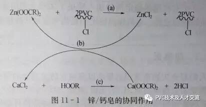 羧酸锌同聚氯乙烯中烯丙基氯反应是钙锌复合稳定剂稳定作用的主反应,羧酸钙的存在将锌皂与PVC的不稳定氯原子反应生成的有害ZnCl2 再生成为锌皂,从而一方面活化了锌皂,另一方面又大大降低其催化能力,而自身转变成无害的氯化钙,从而抑制了ZnCl2 的破坏作用,原理如图11-1